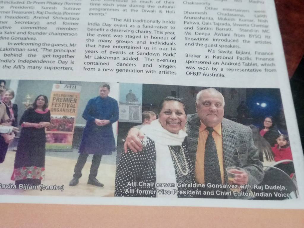 At a 2016 Indian Independence Day Celebration in Melbourne. Pictured in the September 2016 edition of The Indian Voice page 46 with the Chief Editor of Indian Voice. Mr Raj Dudeja.