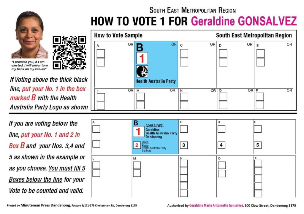A VOTE 1 for Geraldine GONSALVEZ in the SOUTH EAST METROPOLITAN REGION and the Health Australia Party is A healthy choice. Why leave the defence of your personal freedom for others to choose – Be in control of your informed consent and your freedom to choose in all decisions. Especially in matters of your personal health and well-being. Democracy is not a spectator sport. A Healthy Democracy depends on how you vote.